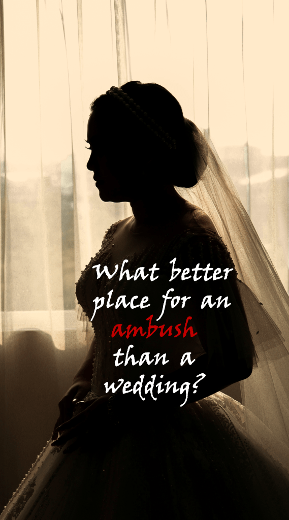 About half the hooks are the same or very similar with very similar images: a cloaked figure with a metal skull for a head with something along the lines of “When a man who was more metal than flesh entered her father’s shop, her life changed forever.” Others get more thematic to the excerpt/images. One scene takes place at a wedding, so the hook is “What better place for an ambush than a wedding?” You get the idea…